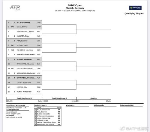 体育资讯4月12日报道宣称 ATP500慕尼黑站资格赛签表出炉,布云朝克特作为头号种子首轮对阵戈约,若获胜次轮迎战舍甫琴科和土方凛辉的胜者。勒纳·钱、范德尚舒普、布勃里克、曾俊欣等球员也将出战。
