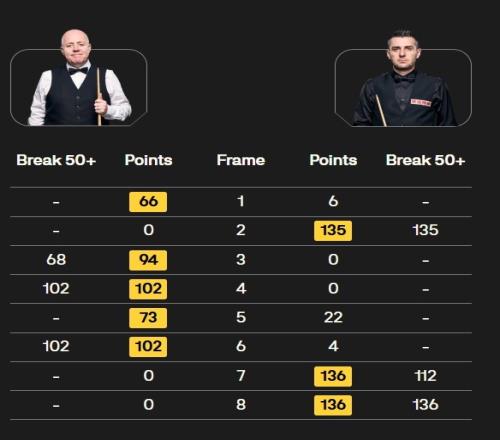 在第一阶段比赛中,希金斯一共打出两杆破百(102、102)和一杆50+(68),塞尔比打出3杆破百(135、112、136)。