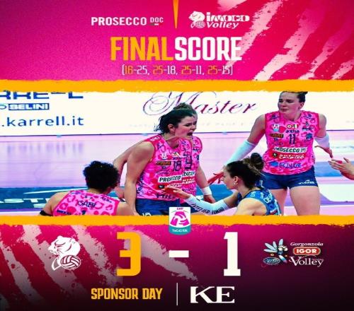 意甲女排半决赛,科内利亚诺对阵诺瓦拉,双方前两个回合战成1-1平。第三回合较量,科内利亚诺主场3-1(16-25/25-18/25-11/25-15)取胜,总分2-1领先,在5场3胜的赛制中率先拿到赛点。