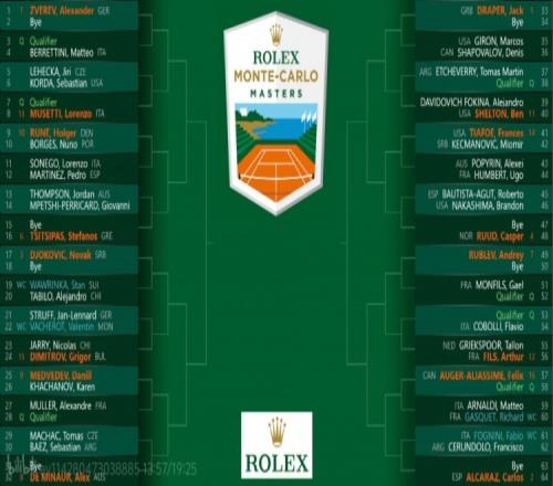 蒙特卡洛大师赛签表公布,男单前八种子1/4区对位如下: