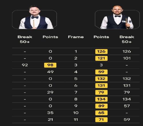 本场比赛,霍金斯在前8局就轰出了5杆单杆破百,以7比1的巨大领先优势结束第一阶段比赛。