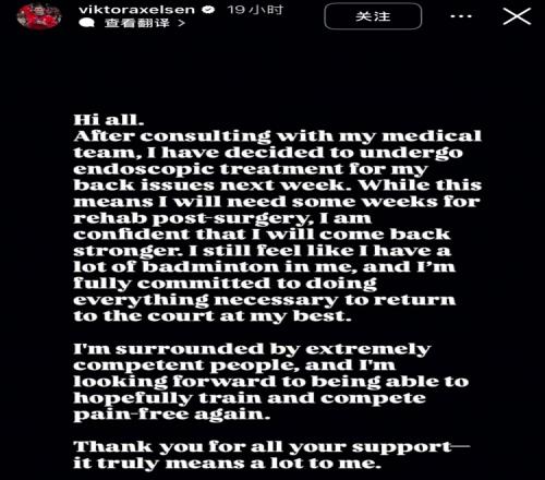 安赛龙写道:“大家好!关注我的人都知道,最近我的背伤一直困扰着我。经过和医疗团队的商量,我决定接受内窥镜手术来解决这个问题。手术后需要一段时间康复,但我相信自己会以更好的状态回归赛场。我仍然觉得自己在羽毛球生涯中还有很多可能,所以我会全力以赴,争取以最佳状态回归。”