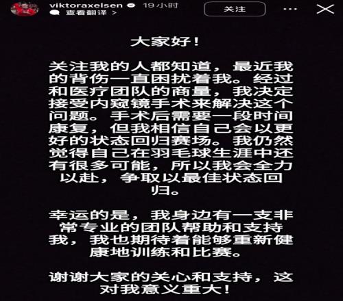 体育资讯3月30日报道宣称 今日,丹麦名将安赛龙在社媒用中英双语发布公告,表示自己将通过内窥镜手术来治疗背伤,并将因此缺席一段时间的比赛。