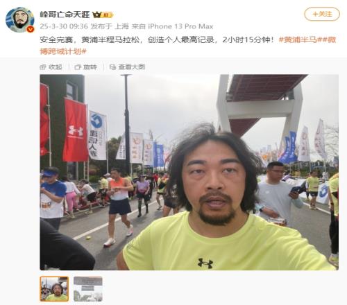 2025上海黄浦半程马拉松今日进行,网红周丽峰(“峰哥亡命天涯”)2小时15分22秒完赛刷新PB,与一周前的无锡马拉松相比进步10分24秒。