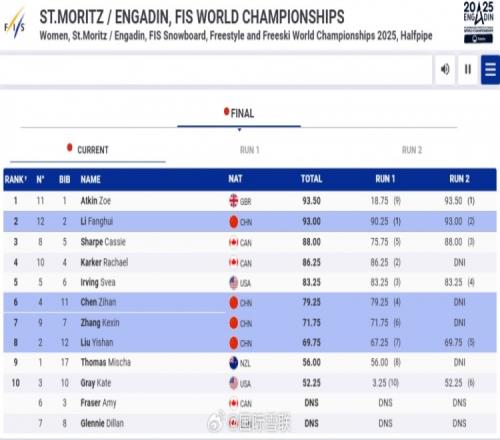 体育资讯3月30日报道宣称 2025自由式滑雪和单板滑雪世锦赛-自由式滑雪U型场地技巧女子决赛,佐伊-阿特金领先李方慧0.50分获得冠军,李方慧获得亚军。