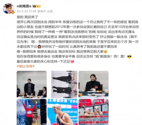 体育资讯3月23日报道宣称 2025年全国春季游泳锦标赛女子100米蝶泳决赛,张雨霏以58秒21的成绩排名第五,无缘领奖台。赛后,张雨霏更新社媒。