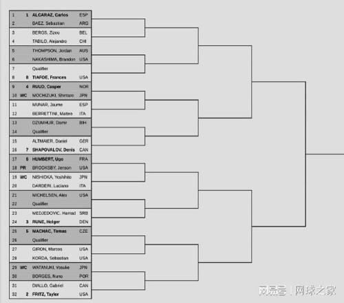 另外,ATP500东京站公布了男单正赛签表。世界第一阿尔卡拉斯、美国一哥弗里茨、“北欧双鲁”位列前四号种子。前八大种子对位如下:上半区,阿尔卡拉斯--蒂亚弗、鲁德--沙波瓦洛夫;下半区,恩贝尔--鲁内、马哈奇--弗里茨。