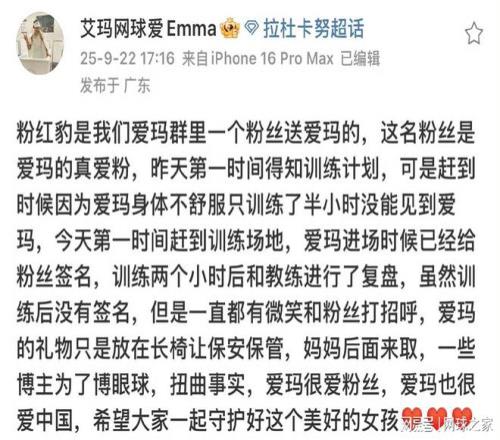 该粉丝详细叙述了当天的经过:拉杜卡努在训练开始前已经为等候的粉丝签名,尽管当天因身体不适只训练了半小时,但她始终保持着友善态度,微笑着与粉丝打招呼。 礼物确实暂时放在长凳上,但随后由保安保管,最终由拉杜卡努的母亲取走。