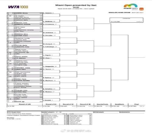 迈阿密大师赛女单签表:郑钦文担任9号种子,首轮轮空
