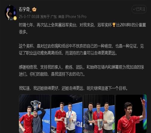 难掩激动!石宇奇全英赛夺冠后发文:这个冠军比2018年的分量重