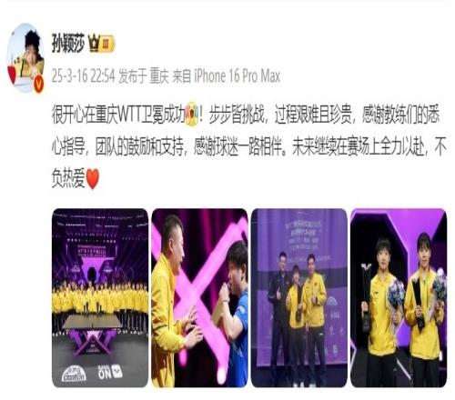 孙颖莎夺冠后在社媒晒照并分享道:“很开心在重庆WTT卫冕成功!步步皆挑战,过程艰难且珍贵,感谢教练们的悉心指导,团队的鼓励和支持,感谢球迷一路相伴。未来继续在赛场上全力以赴,不负热爱。”
