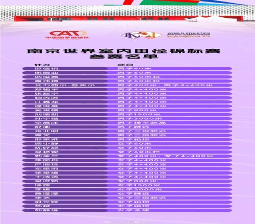体育资讯3月14日报道宣称 中国田径队公布南京世界田联室内锦标赛名单,谢震业、吴艳妮等35位运动员参赛。