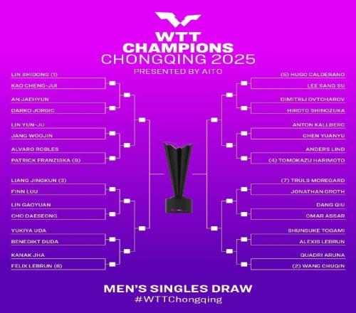 WTT重庆冠军赛男单16强对阵:王楚钦vsA勒布伦林诗栋vs安宰贤
