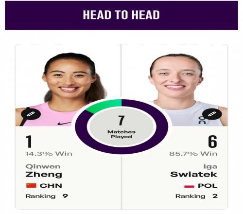 郑钦文vs斯瓦泰克交手记录:双方曾交手7次,郑钦文1胜6负