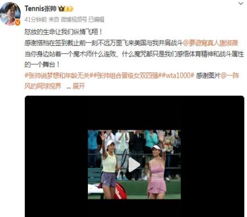 晋级印第安维尔斯站女双四强,张帅更新社媒致谢搭档谢淑薇