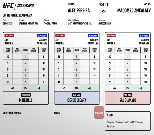 最终五回合结束,安卡拉耶夫以【49-46、48-47、48-47】一致判定击败佩雷拉,夺得UFC轻重量级冠军。安卡拉耶夫在连续14战不败后夺冠。