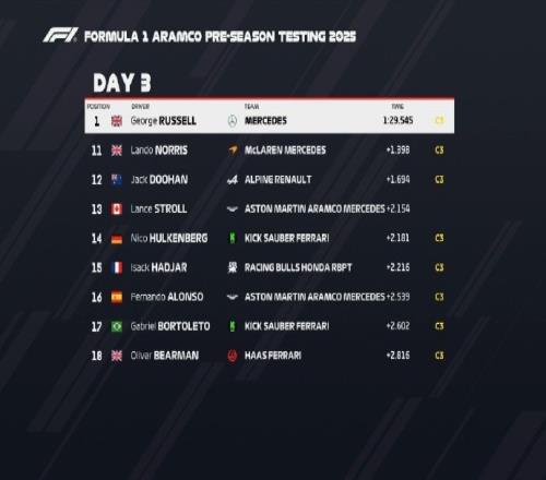 体育资讯3月1日报道宣称 2025年F1季前测试第三日结束,最终成绩方面,圈速方面拉塞尔拿下头名,维斯塔潘第二。