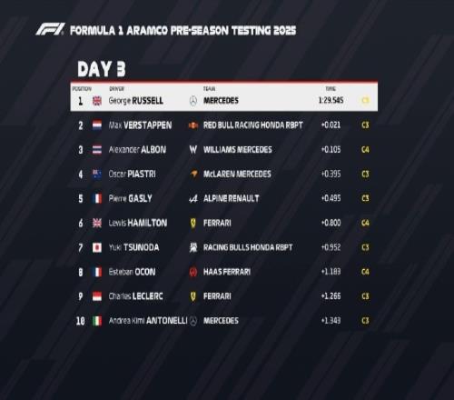 季前测试第三日最终成绩,圈速方面,拉塞尔搭载C3轮胎拿下头名,圈速为1:29.545。维斯塔潘第二,差距仅为0.021秒。阿尔本的C4轮胎成绩排名第三。