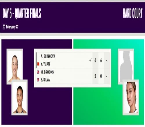 在本场比赛中,袁悦与布林科娃搭档,最终以6-2 6-0的比分2-0横扫布洛克斯/席尔瓦组合,晋级半决赛。