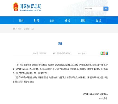 体育总局乒羽中心:谴责侮辱中国运动员言行,将会同相关部门打击