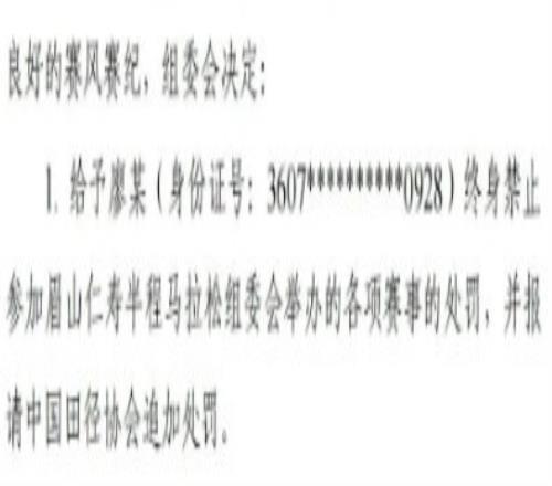 26日,赛事运营方四川博捷体育文化传播有限公司副总经理刘应告诉上游新闻记者,已经对违规套用其他选手号码的参赛者作出了处罚,“处罚决定已在眉山仁寿半程马拉松官微发布。”处罚决定书显示,已给予廖某终身禁止参加眉山仁寿半程马拉松组委会举办的各项赛事的处罚,并报请中国田径协会追加处罚。