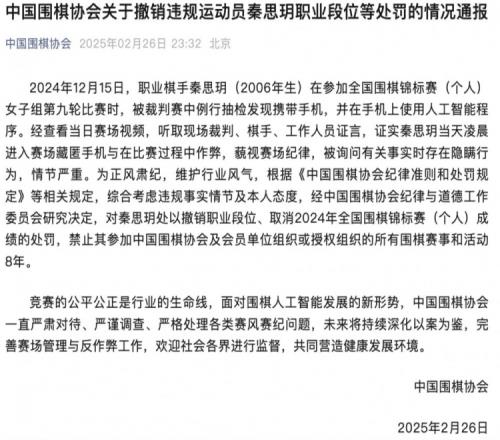 2024年12月15日,职业棋手秦思玥(2006年生)在参加全国围棋锦标赛(个人)女子组第九轮比赛时,被裁判赛中例行抽检发现携带手机,并在手机上使用人工智能程序。经查看当日赛场视频,听取现场裁判、棋手、工作人员证言,证实秦思玥当天凌晨进入赛场藏匿手机与在比赛过程中作弊,藐视赛场纪律,被询问有关事实时存在隐瞒行为,情节严重。