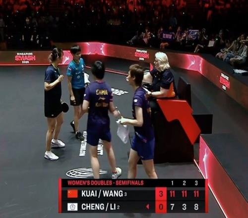 WTT新加坡大满贯女双半决赛,王曼昱/蒯曼3-0战胜郑怡静/李昱谆,晋级决赛,三局比分为11-7、11-3、11-8。