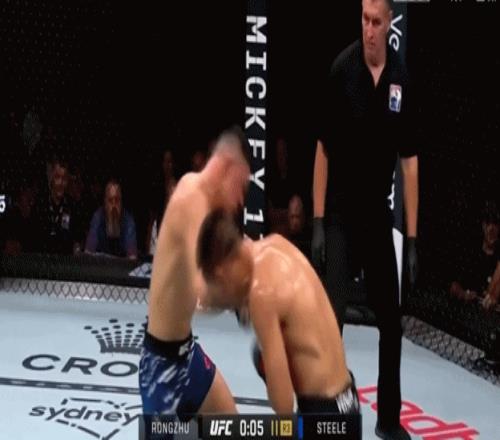 第二回合开始,斯蒂尔直接进地面战,斯蒂尔锁住茸主腿,之后茸主挣脱。双方起身后,继续试探。茸主连续前摆非常主动,多次击中斯蒂尔下巴。