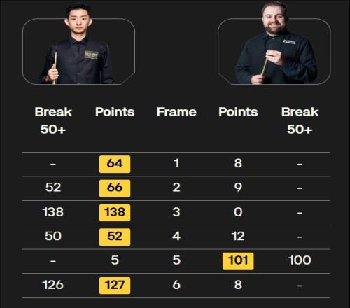 本场比赛是64进32轮次,吴宜泽打出单杆138、52、50分,在上半场连胜四局率先拿到赛点以4-0的领先进入中场休息。