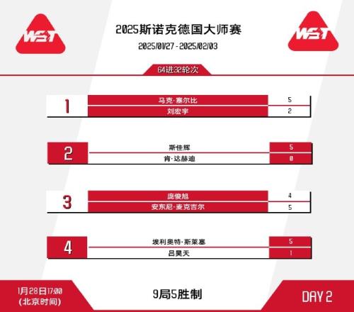 斯诺克德国大师赛今天继续进行64进32轮次的较量,在17点开始的比赛场次中,马克-塞尔比5-2击败刘宏宇、斯佳辉5-0击败达赫迪、麦克吉尔5-4击败庞俊旭,埃利奥特-斯莱塞5-1击败吕昊天,这4位球员晋级32强。