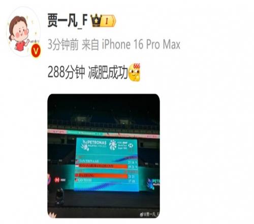 贾一凡更新社媒,发布现场照片,并配文:288分钟,减肥成功。