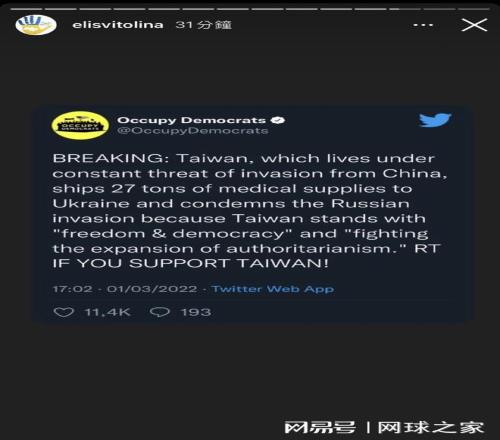 对于斯维托丽娜来说,争议还不止是单纯在新冠疫情期间。2022年3月,乌克兰人甚至一度直接在个人ins上面转发了一条明显是支持台独的帖子。