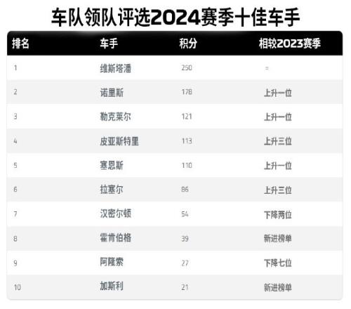 车队领队评选2024赛季F1十佳车手:维斯塔潘连续四年排名第一