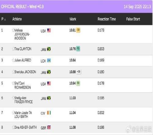 9月14日,2025年东京田径世锦赛女子100米决赛, 美国选手杰斐逊-伍登10秒61打破世锦赛纪录夺得金牌,克莱顿10秒76获得银牌,阿尔弗雷德10秒84获得铜牌。