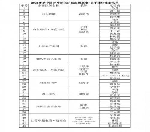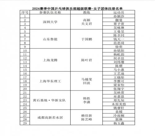体育资讯12月9日报道宣称 2024乒超联赛第一阶段将于12月12日-16日在湖南长沙中南大学体育馆进行,2024乒超联赛各俱乐部注册名单公布。