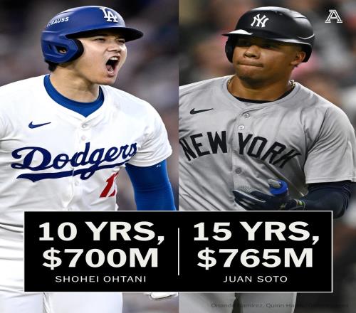 谁更赚大谷翔平10年7亿但97%十年后付,索托7.65亿无延期付款
