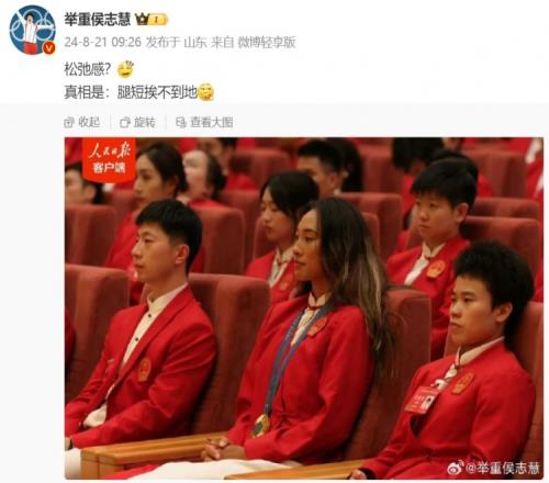 体育资讯8月23日报道宣称 奥运冠军侯志慧参加完奥运总结大会之后,在社媒调侃自己当时表情松弛的真相是:腿短挨不到地。