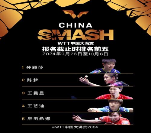 WTT中国大满贯2024将于9月26日至10月6日在北京石景山首钢园举行。冠军将获得2000点世界排名积分。报名截止时排名前五名单如下: