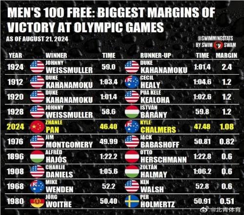 潘展乐的领先优势,可以排到历史第五位。在1924年奥运会上,当时的冠军曾领先第二名2.4秒,排在该榜单第一。