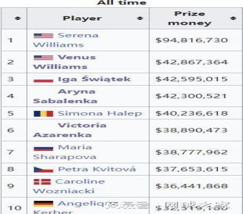 WTA历史奖金榜排名前五如下: