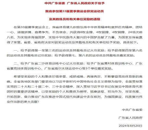在第33届夏季奥运会上,我省体育健儿积极弘扬中华体育精神和奥林匹克精神,团结一心、顽强拼搏,奋勇争先、不负使命,共获得8枚金牌、4枚银牌、4枚铜牌、24项次前八名,为实现体育强国梦、实现中华民族伟大复兴的中国梦贡献了力量,为国家及我省赢得了荣誉。省委、省政府决定对获奖运动员及其教练员和有关单位给予奖励,具体如下。