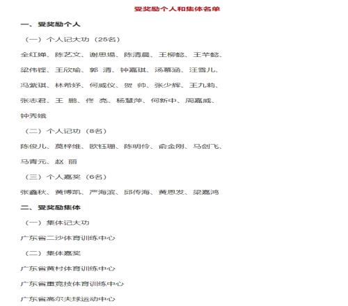 二、给予广东省二沙体育训练中心记大功奖励;给予广东省黄村体育训练中心、广东省重竞技体育训练中心、广东省高尔夫球运动中心等3个单位嘉奖奖励。