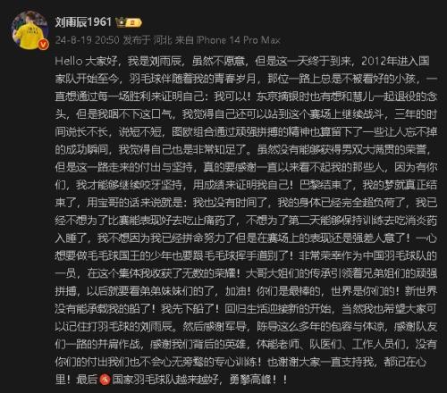 新世界没有能承载我的船了!我先下船了!回归生活迎接新的开始,当然我也希望大家可以记住打羽毛球的刘雨辰。然后感谢军导,陈导这么多年的包容与体谅,感谢队友们一路的并肩作战,感谢我们背后的英雄,体能老师、队医们、工作人员们,没有你们的付出我们也不会心无旁骛的专心训练!也谢谢大家一直支持我,都记在心里!最后㊗️国家羽毛球队越来越好,勇攀高峰!!