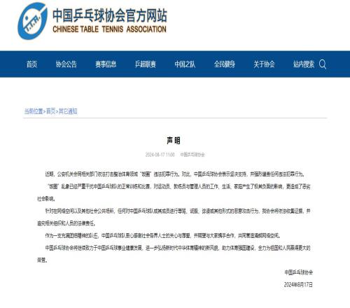 体育资讯08月17日报道宣称 中国乒乓球协会在官网发布声明表示饭圈乱象干扰正常训练比赛,将依法收集证据追责。
