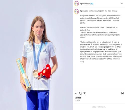 体育资讯08月17日报道宣称 当地时间8月16日,罗马尼亚体操运动员安娜-巴尔博苏在布加勒斯特获颁巴黎奥运会体操项目女子自由操铜牌。