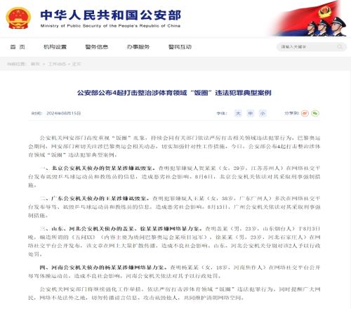 公安部公布4起打击整治涉体育领域“饭圈”违法犯罪典型案例