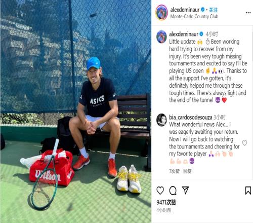 今天,德米纳尔社媒宣布将在美网复出,他写道:“更新下我的情况,我一直在努力从伤病中恢复,错过巡回赛非常艰难,我很高兴地宣布我将参加美国网球公开赛。感谢大家对我的支持,这无疑帮助我度过了这些艰难的时期,隧道尽头总会有光明。”