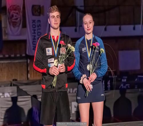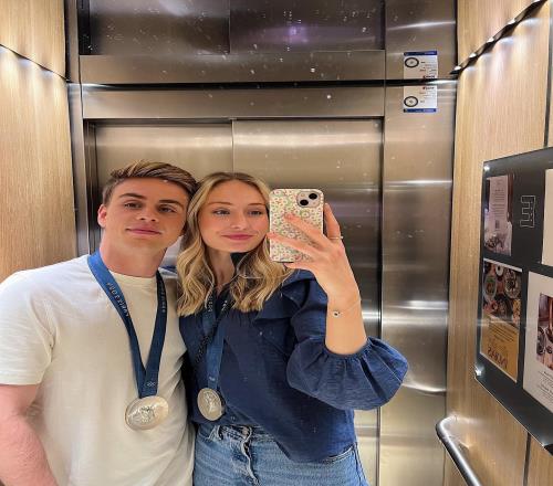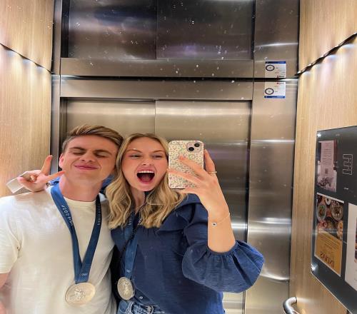 莫雷加德的女友Leah Bianca Tveit Muskantor更新社媒晒出近照,莫雷加德与女友各戴一面银牌玩自拍。