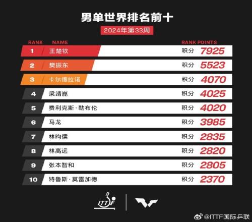 国际乒联最新排名:王楚钦樊振东男单前二孙颖莎陈梦女单前二