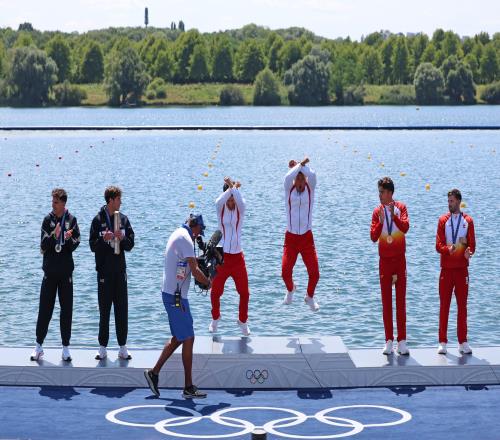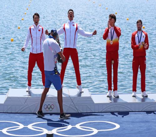 巴黎奥运男子500米双人划艇,中国选手刘浩和季博文以1分39秒48的成绩强势夺金。在领奖仪式上,二人做出了C罗的标志性霸气庆祝动作。↓